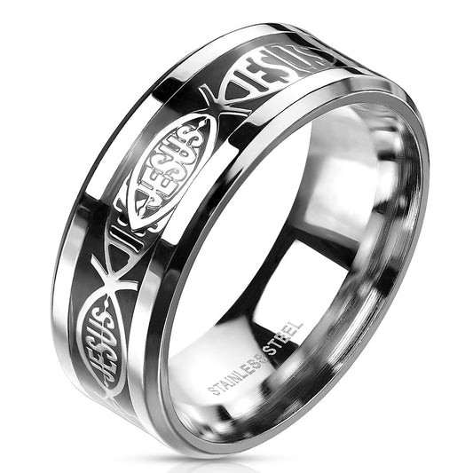 Misty Blue Solomon Jesus Fish Inlaid Stainless Steel Band Ring
